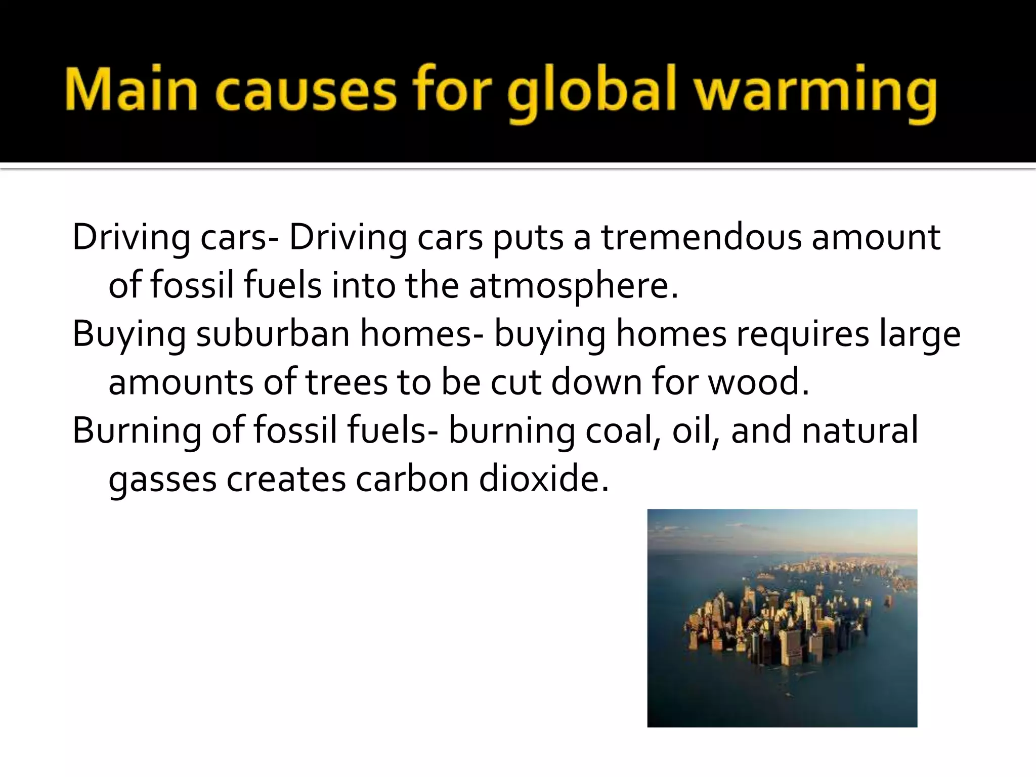 Global warming is caused by human activities like driving cars, living in suburban homes, and burning fossil fuels which release carbon dioxide into the atmosphere. If left unaddressed, global warming will lead to more severe hurricanes, flooding, and desertification. We can all help address global warming by planting trees, driving hybrid cars, using more energy efficient light bulbs, recycling paper, and other everyday actions that reduce our carbon footprint. The document outlines the main causes and impacts of global warming, as well as individual actions we can take to help stop global warming.