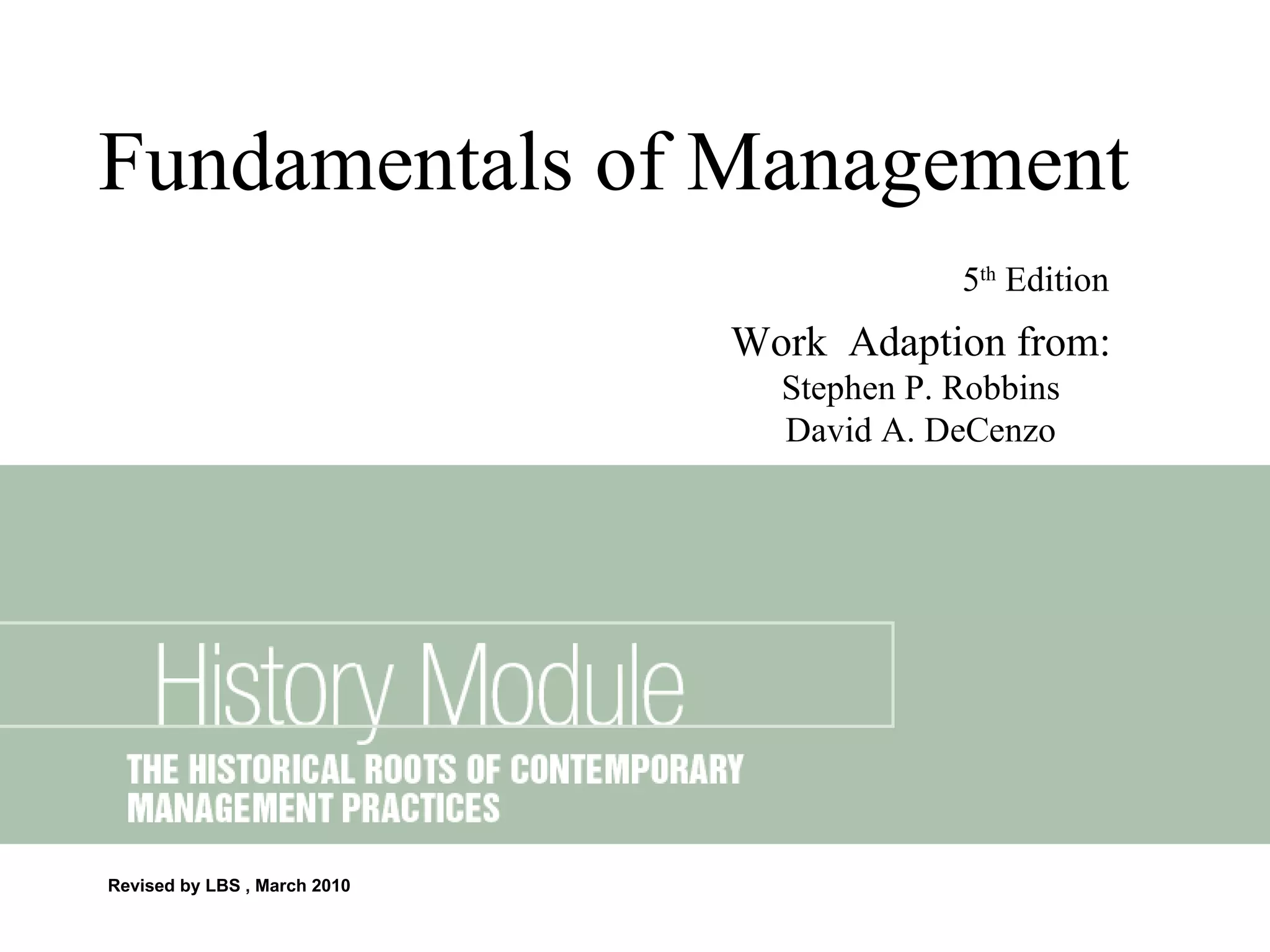 The document summarizes several classical and modern approaches to management theory. It describes scientific management theories proposed by Taylor and the Gilbreths which aimed to optimize efficiency. It also outlines Henri Fayol and Max Weber's general administrative theories, including Fayol's 14 principles of management and Weber's ideal bureaucracy. Quantitative, behavioral, contingency and other contemporary approaches are also summarized as frameworks that managers can apply depending on organizational needs and situations.