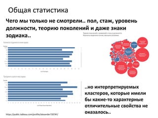 Документ обсуждает методы повышения эффективности обучения на примере хакатона HR, проведенного в ноябре 2016 года. Рассматривается статистика, включая социальные и бизнес-параметры сотрудников, а также различные подходы к разработке рекомендаций, такие как коллаборативная фильтрация и контентная система. Также упоминаются предпочтения сотрудников и их активность в обучении.