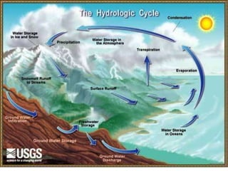 The hydrosphere includes all water on Earth's surface and subsurface in liquid or frozen form, such as oceans, seas, lakes, rivers and groundwater. It covers 70% of Earth's surface, primarily as oceans, and provides habitat for many organisms. Water cycles between reservoirs in the hydrosphere, atmosphere and geosphere through evaporation, condensation and precipitation in a continuous circular motion.