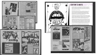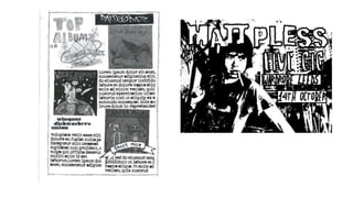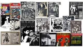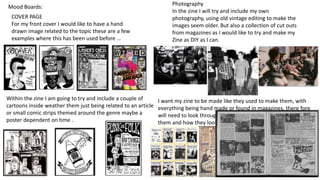 This document outlines plans for creating a zine about folk punk music. It includes mood boards showing appropriate fonts, colors, album covers and posters for inspiration. The document discusses including hand-drawn images, photos edited to look old, and cutouts from magazines to achieve a DIY aesthetic. A production schedule is provided, allocating one week each for writing text, drawing images, and assembling the zine. Pages will feature articles on record labels and albums, advertisements, and discussions of the music's philosophy. The cover will incorporate the folk punk symbol and band logos.