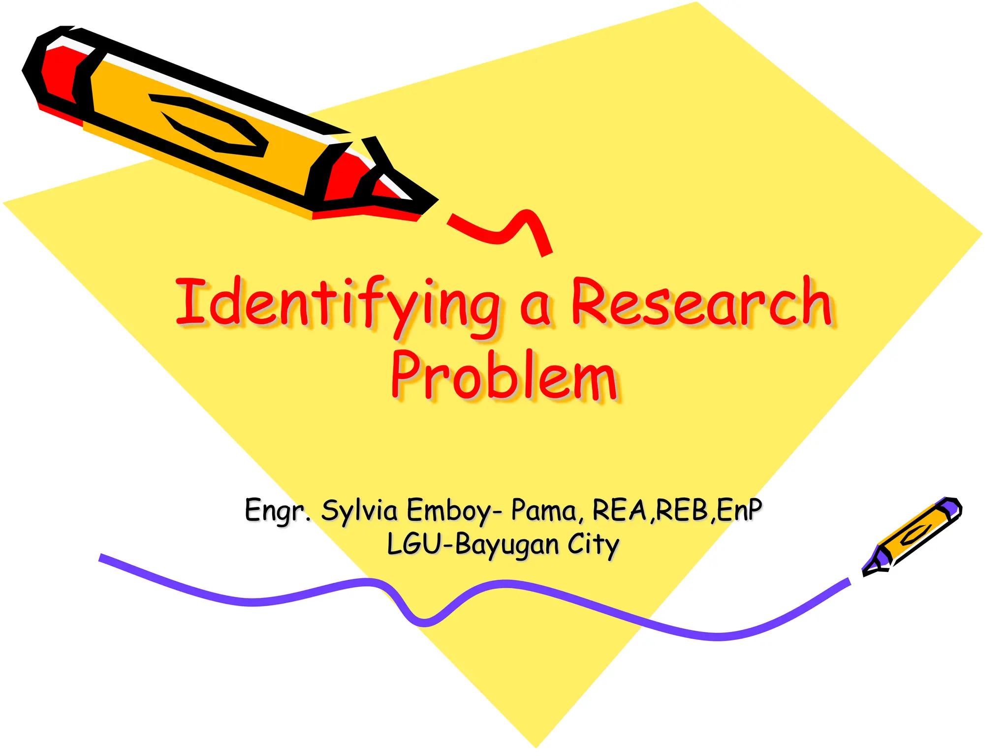 The document discusses problem identification in research, outlining its significance and various sources for problem formulation, such as literature and societal concerns. It highlights essential factors in selecting a research problem, characteristics of a good problem statement, and criteria for assessing the appropriateness of research problems. Additionally, it includes examples of potential research titles and problem areas across various subjects.
