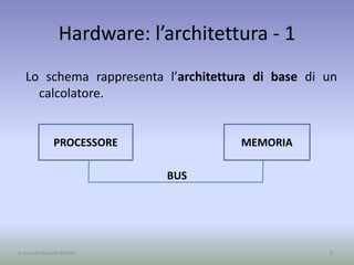 Il documento fornisce una panoramica dell'architettura di base di un computer, descrivendo i principali componenti come il processore, la memoria RAM e la memoria di massa. Viene spiegato come funzionano il ciclo di clock e l'overclock, oltre a contenuti relativi a memoria, periferiche e la loro interazione con il sistema. Si affrontano anche le sfide future nella tecnologia dei processori e la gerarchia della memoria.