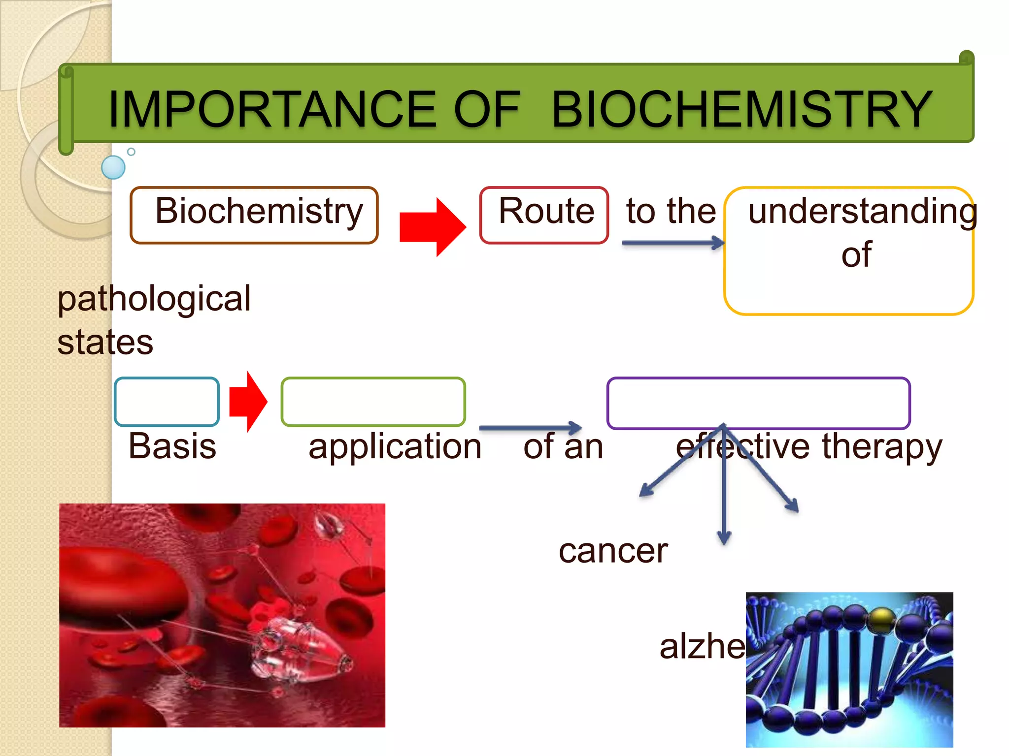 Biochemistry provides an understanding of pathological states and is the basis for effective therapies like cancer treatments. Biochemical techniques can detect microorganisms and understand molecular tendencies in medicine. Biochemistry also compares what is missing in the body and how to replace it. It is important for understanding how drugs function and how diseases operate at a cellular level so targeted treatments can be designed.