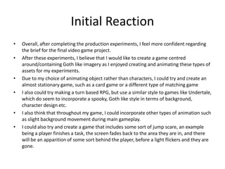 Rebecca Edwards provides an initial reaction and plans for her final video game project. She feels more confident after completing production experiments. She wants to create a game with Gothic imagery centered around animation she enjoyed creating. Due to animating objects not characters, she considers a stationary game like a card or matching game. She also considers a turn-based RPG with a spooky Gothic style like Undertale. Background animation during gameplay and jump scares are other ideas. A mind map and mood board are included to influence the Gothic/horror style, characters, environment and puzzles in the mansion setting game. A schedule outlines weeks for research, production, and evaluation. Seven sources for audience research, games and other media are cited for the