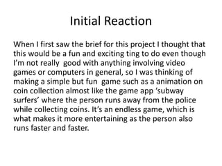 This document outlines initial plans for a coin collection video game project. The author considers making a simple game similar to "Subway Surfers" where the player collects coins while running from obstacles. Alternative ideas include shape-based or character-based games. Plans for the game's sound, graphics, characters and schedule are discussed. A mood board analysis shows inspiration from bright, colorful coin collection games. The document does not provide sources to be used.
