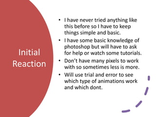 - A 5 week schedule is proposed, starting with experiments and research, followed by production of backgrounds, characters and screens, then adding sound and evaluating with peer feedback.