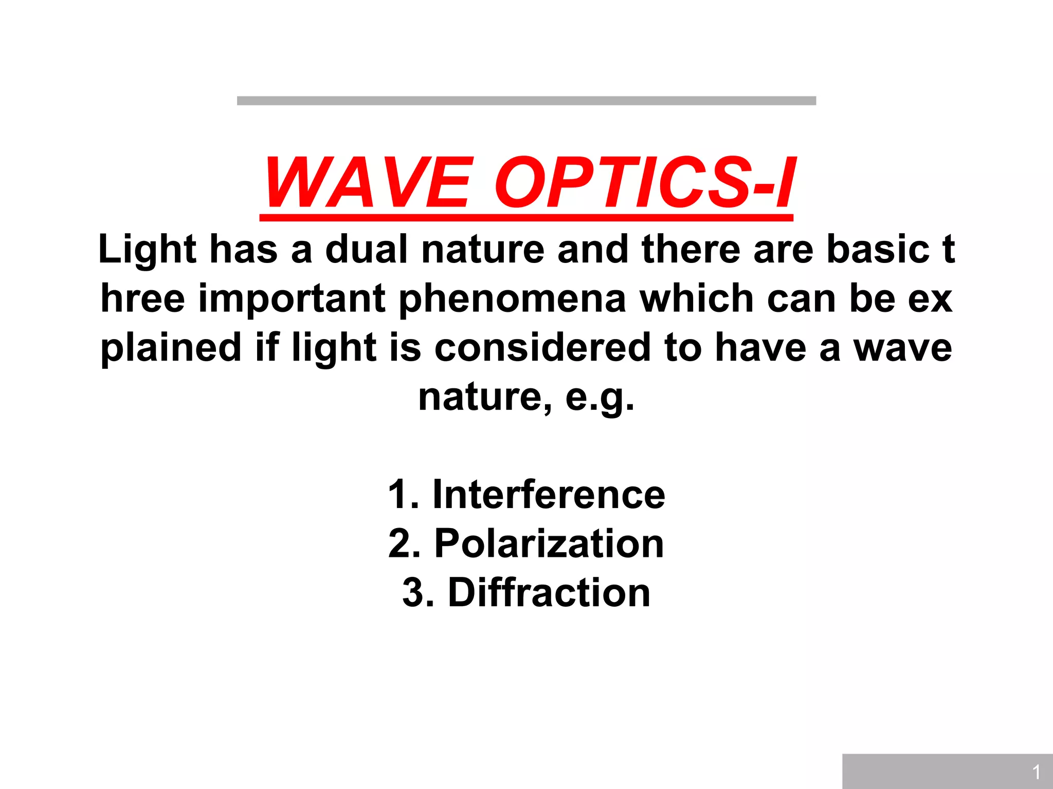 The document discusses wave optics, focusing on the wave nature of light and its phenomena such as interference, diffraction, and polarization. It explains concepts like coherence, monochromatic light, and the conditions for constructive and destructive interference, illustrated through Young's interference experiment and thin film interference. Additionally, it explores mathematical relationships governing these phenomena and presents questions to reinforce understanding.