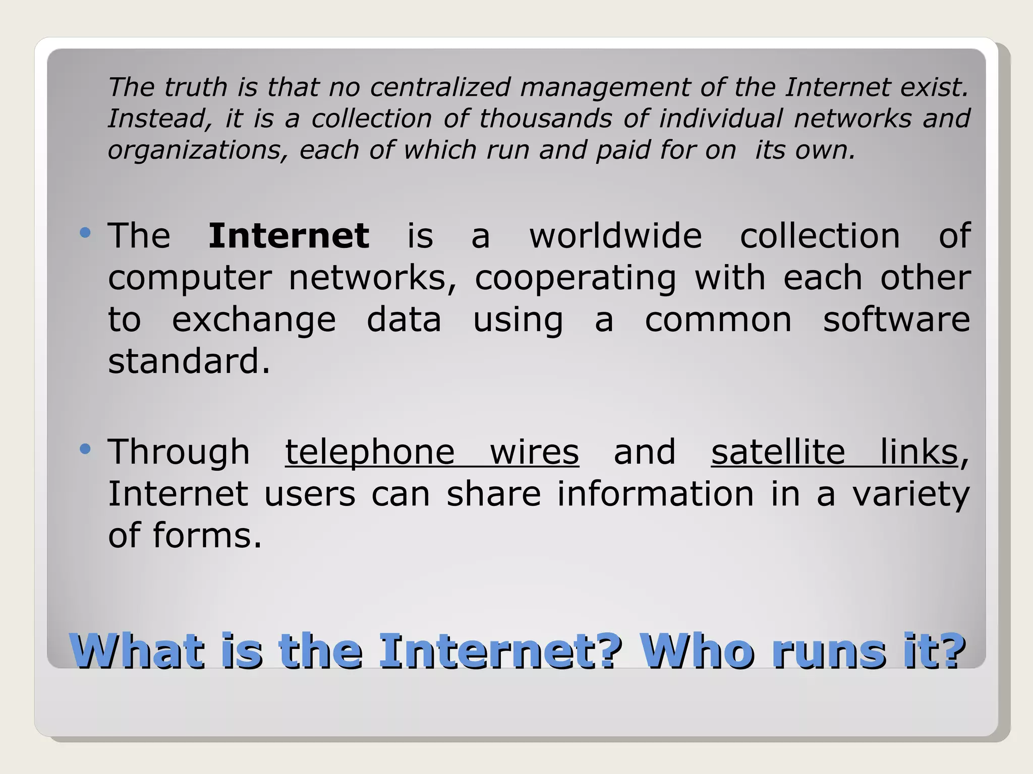 The document provides an overview of the history and workings of the Internet. It discusses how the Internet is a worldwide collection of computer networks that cooperate to share data using common protocols. It then outlines the development of key technologies and events from 1969 to 2008 that have shaped the Internet, including the creation of ARPANET, TCP/IP, the World Wide Web, Google, and social media. Finally, it describes how computers connect to the Internet, browsers work to access and display web pages, and some common browser features.