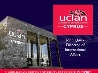 The University of Central Lancashire (UCLan) is a British university based in Preston, England that has existed in various forms since 1828. It has over 5,000 international students enrolled both in the UK and through transnational education partnerships. UCLan emphasizes sustainability, employability, research and innovation, and internationalization in its strategy. It has over 70 professors and 600 research-active staff conducting significant international research projects. UCLan aims to increase its number of international students on campus to 2,500 and through transnational education to 5,000 by 2016-2017.