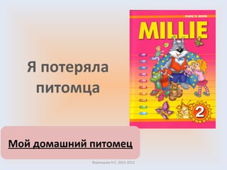 Документ содержит задания и упражнения для изучения языка, посвященные теме домашних питомцев. Включает чтение текстов об объявлении о пропаже питомцев, диалоги, а также песни, связанные с питомцами. Упражнения также предполагают нахождение изображений животных и развитие навыков чтения.