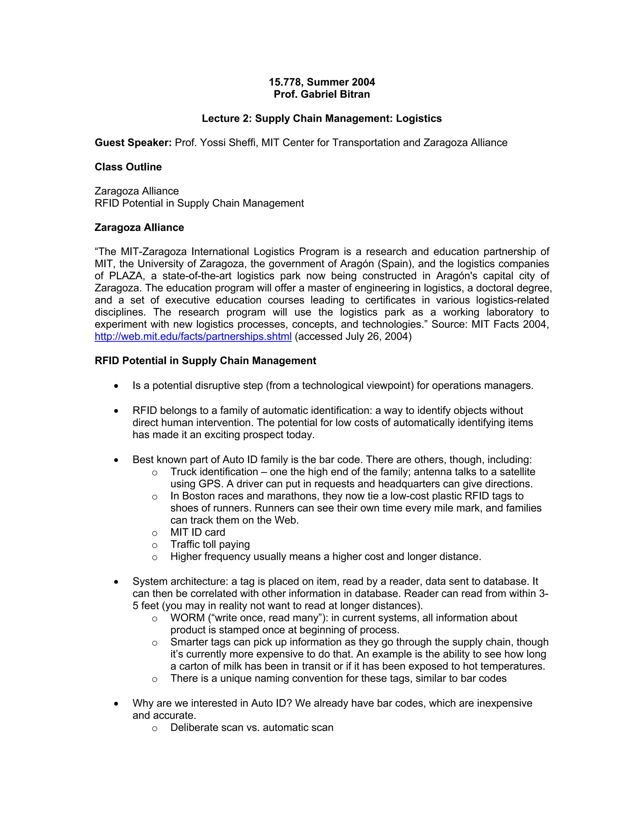 The document summarizes a lecture on supply chain management and logistics. It discusses the MIT-Zaragoza Alliance program and potential applications of RFID technology in supply chains. RFID uses automatic identification to track items without human scanning. This could improve inventory accuracy and enable more automated tracking of items throughout the supply chain. The technology is still developing but may eventually allow items to be tracked from production to store shelves and beyond.