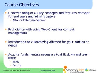 This document provides an introduction to the Alfresco content management system. It outlines the course objectives which are to understand key concepts and features for end users and administrators. It then describes the Alfresco architecture, products, key features including document management, security, and customization. Finally, it provides an overview of the company background and roadmap for future releases.