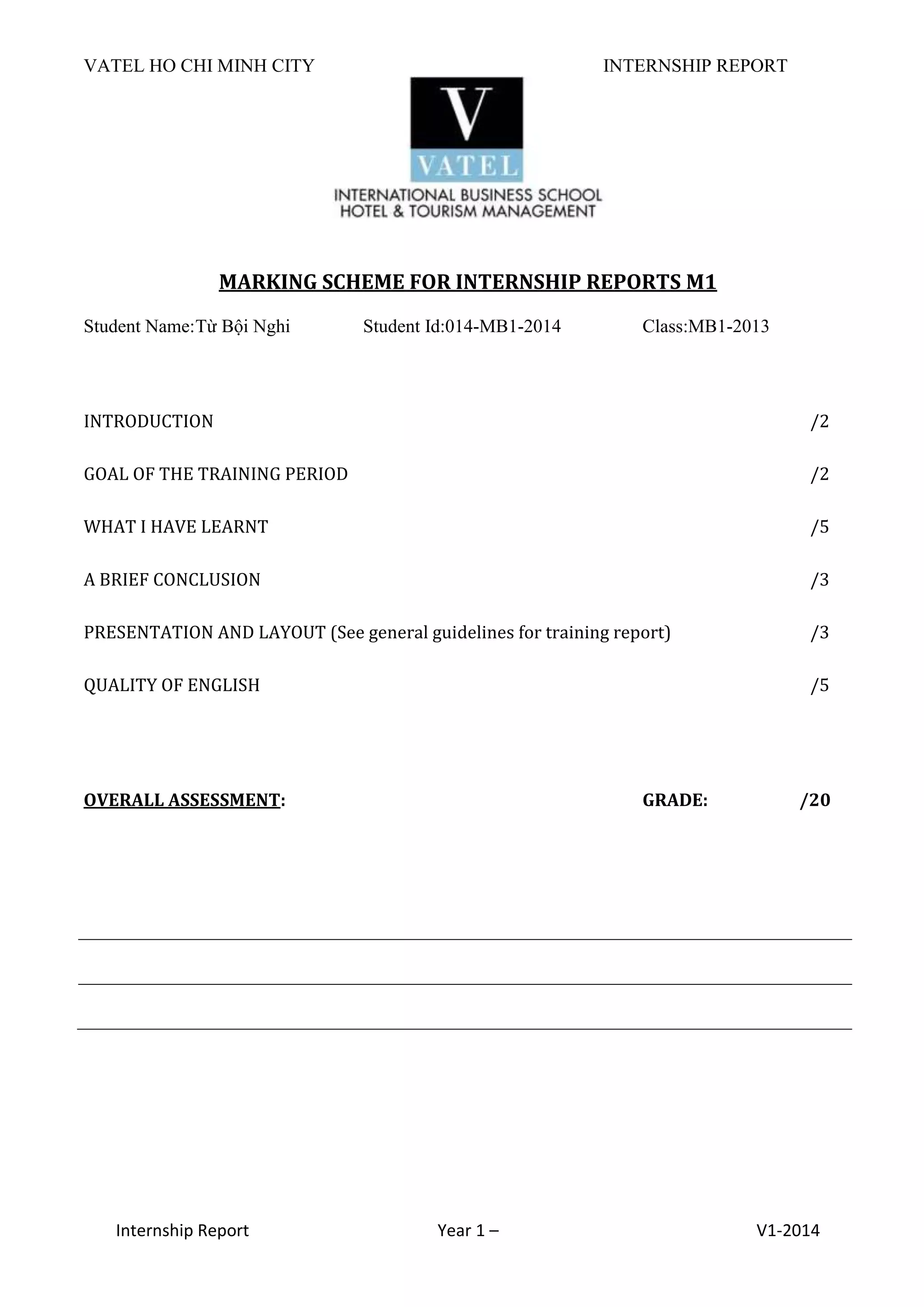 This internship report summarizes the student's 4-month internship experience at the Edensee Lake Resort in Da Lat, Vietnam. It provides an introduction to the resort, including its history, facilities, departments, and organizational structure. The report then describes the student's roles and responsibilities in the Food and Beverage department, focusing on their work as a waitress at the resort's Riesling restaurant. It concludes with the student's assessment of what they learned during their internship.