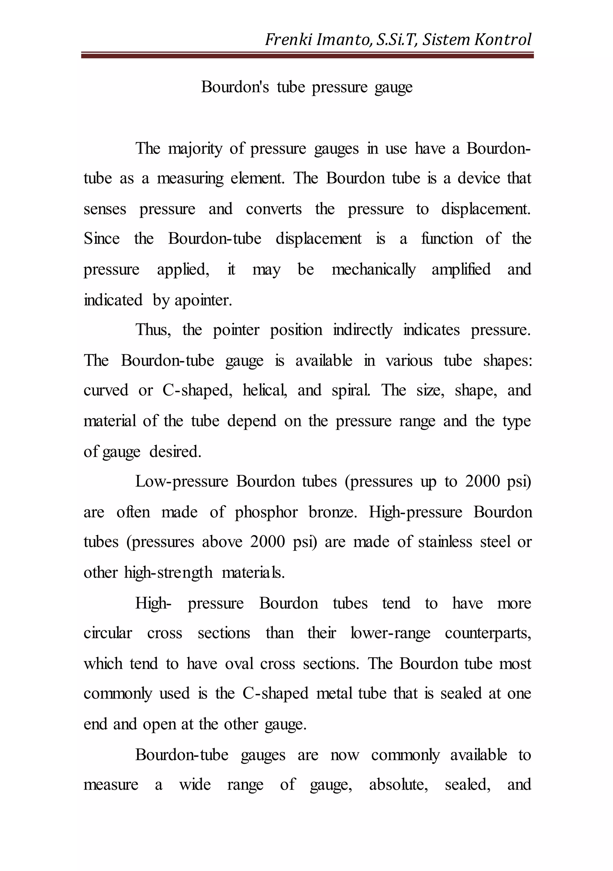 The Bourdon tube is the most common type of pressure gauge, where a metal tube senses pressure and converts it to displacement. As pressure increases, the tube tries to straighten out, causing its tip to move. This movement is amplified mechanically and indicated by a pointer to indirectly show pressure level. Bourdon tubes come in different shapes like C-shaped, helical, and spiral, with the material and size depending on the desired pressure range and gauge type. C-shaped tubes are most common, where pressure inside tries to straighten the tube and moves the tip to indicate pressure.