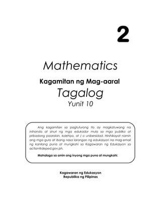 Ang dokumento ay isang kagamitan sa pagtuturo para sa ikalawang baitang ng asignaturang matematika, na partikular sa Yunit 10. Nagtatampok ito ng mga leksyon at gawain tungkol sa pagsusukat ng haba, mas, at iba pang konsepto sa matematika. Inilathala ito ng Kagawaran ng Edukasyon ng Pilipinas at hinihikayat ang mga guro na magbigay ng puna at mungkahi.