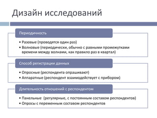 Документ описывает различные методы медиапланирования и исследования, включая опросы, дневниковые исследования и аппаратные методы. Указаны достоинства и недостатки каждого метода, а также примеры использования в телевидении, радио и интернете. В заключительной части рассматриваются компании, занимающиеся исследованием аудитории, и предлагается подготовить презентацию по специальным методам исследования.