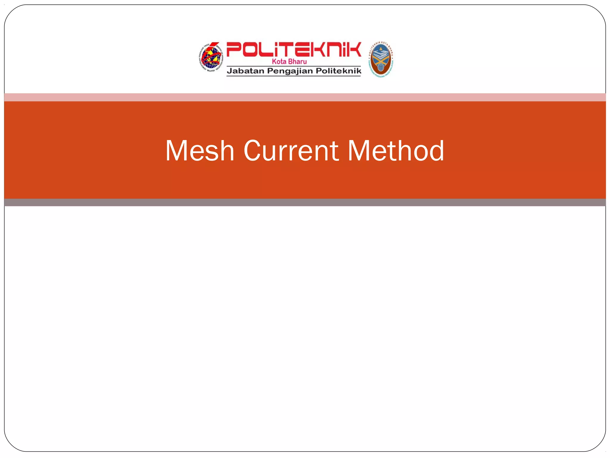 The document introduces the mesh-current method for solving electric circuits. It defines key terms like mesh and essential branch. The steps of the mesh-current method are: 1) identify meshes, 2) assign a current to each mesh, 3) write Kirchhoff's voltage law equations for each mesh in terms of the mesh currents, and 4) solve the resulting system of equations. Examples are provided to demonstrate how to apply the method to circuits with different elements like dependent sources.