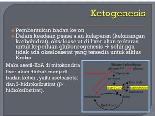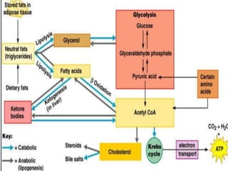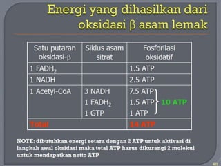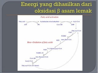 Lemak merupakan sumber energi utama bagi tubuh. Lemak terutama terdiri dari trigliserida yang dapat dihidrolisis menjadi asam lemak dan gliserol. Asam lemak kemudian dioksidasi di mitokondria untuk menghasilkan energi dalam bentuk ATP. Proses ini dapat berjalan ke arah sintesis maupun degradasi asam lemak.