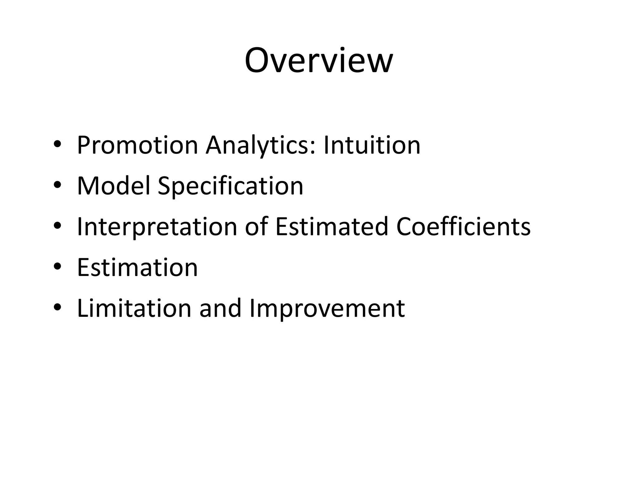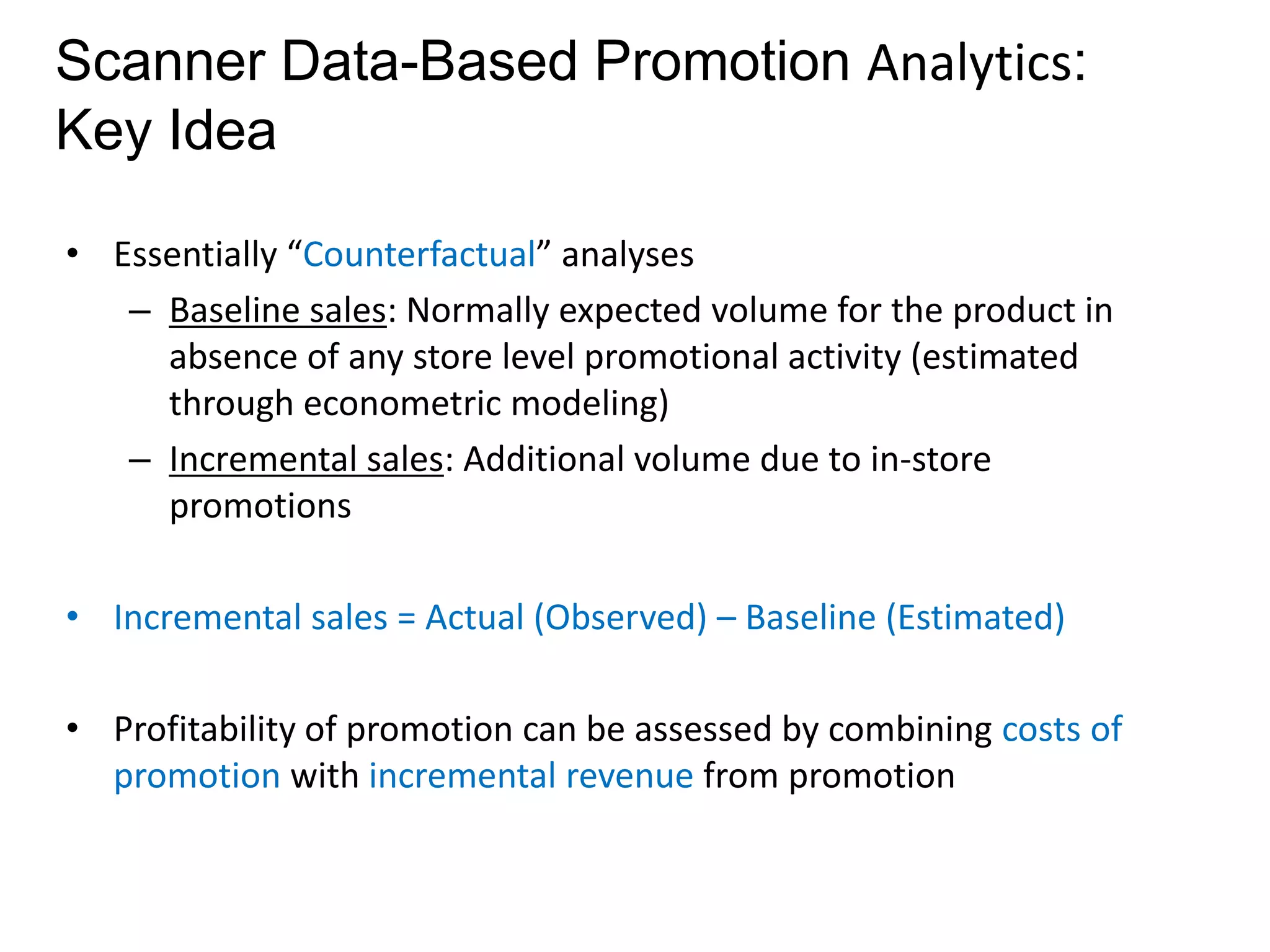 This document provides an overview of promotion analytics using scanner data. It discusses estimating baseline and incremental sales from promotions through econometric modeling. Key aspects covered include model specification, interpretation of coefficients, and limitations. The modeling approach involves log-transforming a multiplicative sales model to make it linear and estimating it using ordinary least squares regression. Baseline sales are estimated by turning off promotions, and incremental sales are calculated as the difference between actual and baseline sales.