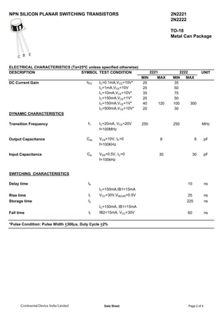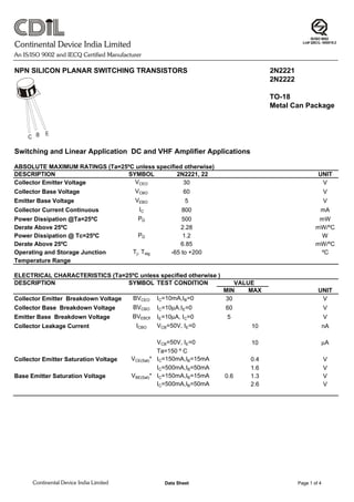 This document provides specifications for NPN silicon planar switching transistors models 2N2221 and 2N2222 in TO-18 metal can packages. Key specifications include: