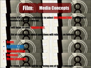 The document provides information about narrative theory and concepts that can be used to analyze media productions for an exam. It discusses several narrative theories and concepts, including: