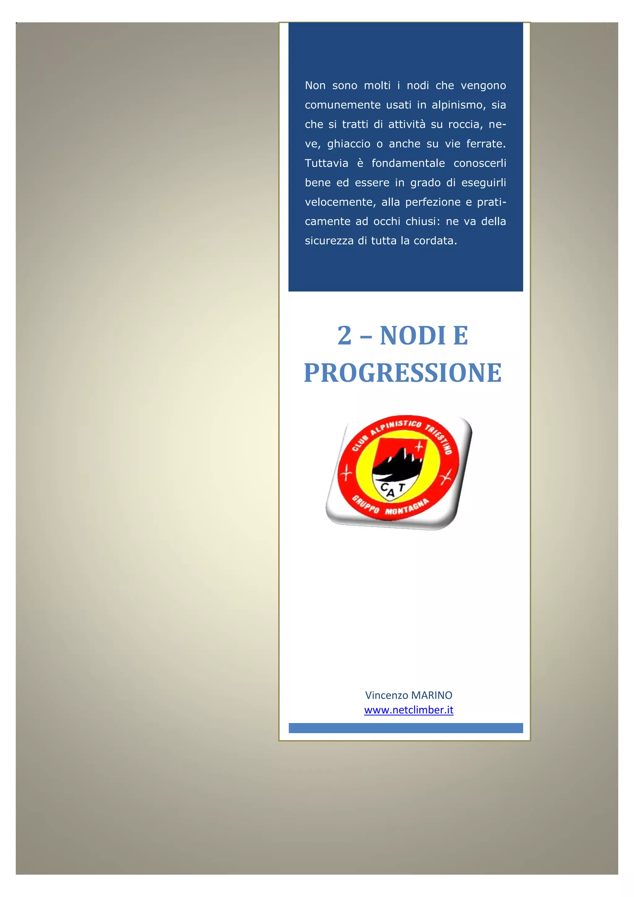 Il documento descrive i nodi fondamentali utilizzati in alpinismo, rimarcando l'importanza della loro esecuzione corretta e della familiarità degli alpinisti con essi per garantire la sicurezza della cordata. I nodi sono categoricamente distinti in nodi di uso generale, collegamento, assicurazione e autoassicurazione, con dettagli sulle tecniche di esecuzione e applicazione pratica. L'apprendimento e la padronanza di questi nodi richiedono esercizio costante e attenzione per evitare confusioni e pericoli.