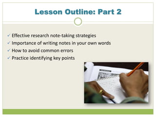 This document discusses effective note-taking strategies from research resources. It outlines different modes of recording information like writing everything down, using outlines, diagrams, highlighting text, audio recording, and their advantages and disadvantages. For example, writing everything allows no information to be lost but is time-consuming. The document emphasizes taking notes in your own words to avoid plagiarism, understanding the information fully before recording it, and questioning sources of information.