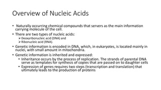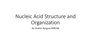 This document summarizes nucleic acid structure and organization. It discusses that nucleic acids are the main information carrying molecules of cells, with DNA located in nuclei encoding genetic information, and RNA facilitating translation of DNA into proteins. The key structures of DNA and RNA are described, including that they are composed of nucleotides containing nitrogenous bases, sugars, and phosphates. DNA contains the bases adenine, guanine, cytosine, and thymine, while RNA contains adenine, guanine, cytosine, and uracil. DNA forms a double helix with bases pairing in a specific way, while RNA is generally single stranded. The document concludes that DNA satisfies the requirements for genetic material by replicating accurately, having a stable structure,