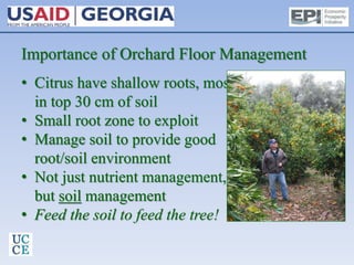 This document provides guidance on orchard floor management techniques for mandarin orchards. It discusses the importance of proper soil and nutrient management for citrus trees, which have shallow root systems. Key recommendations include using no-till practices to protect roots, improving drainage in wet soils, adding organic matter through cover crops, mulches and compost, and dividing fertilizer applications based on soil and tissue tests. Maintaining undisturbed soil with adequate organic matter through these techniques helps promote healthy root growth and maximize fruit yields.