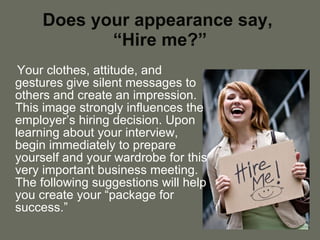 The document provides tips for effectively packaging oneself for a job interview or employment search. It discusses the importance of appearance and first impressions, and provides guidelines for appropriate attire, accessories, hygiene, and behavior. It also outlines 10 Ps of personal branding that include being poised, prepared, proactive, productive, and punctual. Finally, it discusses some acceptable ways to selectively present experiences and accomplishments on a resume, such as highlighting team successes and using numbers or comparisons to showcase strengths.