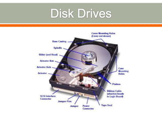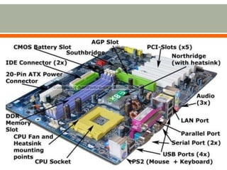 The document provides information on the key components of a personal computer including the power supply, processor, memory, bus, disks, input/output channels, and display. It describes the function of each component and how they connect and interact with each other. It also discusses common hardware issues that can occur and methods for troubleshooting and repairing PCs.