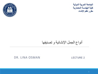 تناقش الوثيقة أنواع الجمل الإنشائية وتصنيفها، حيث تعرف الجملة الإنشائية وعناصرها مثل الأساسات والأعمدة، وتوضح طريقة تحليل وتصميم الجمل الإنشائية. كما يتم تقديم تصنيفات مختلفة للجمل الإنشائية بناءً على القوى والأشكال الهندسية وطريقة النقل. تشمل المعلومات أيضًا الفرق بين الجمل المقررة وغير المقررة وأهمية التحليل الهندسي في تصميم المنشآت.
