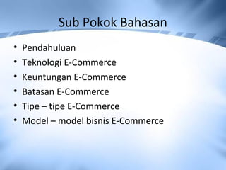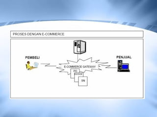 E-commerce melibatkan proses pembelian dan penjualan produk secara online. Dokumen ini membahas teknologi, manfaat, dan jenis model bisnis e-commerce. Teknologi seperti internet dan EDI memungkinkan perdagangan elektronik, sementara model bisnis seperti brokerage dan merchant menghasilkan pendapatan melalui komisi dan penjualan langsung. E-commerce menawarkan efisiensi biaya bagi bisnis dan kenyamanan berbelanja bagi konsumen.
