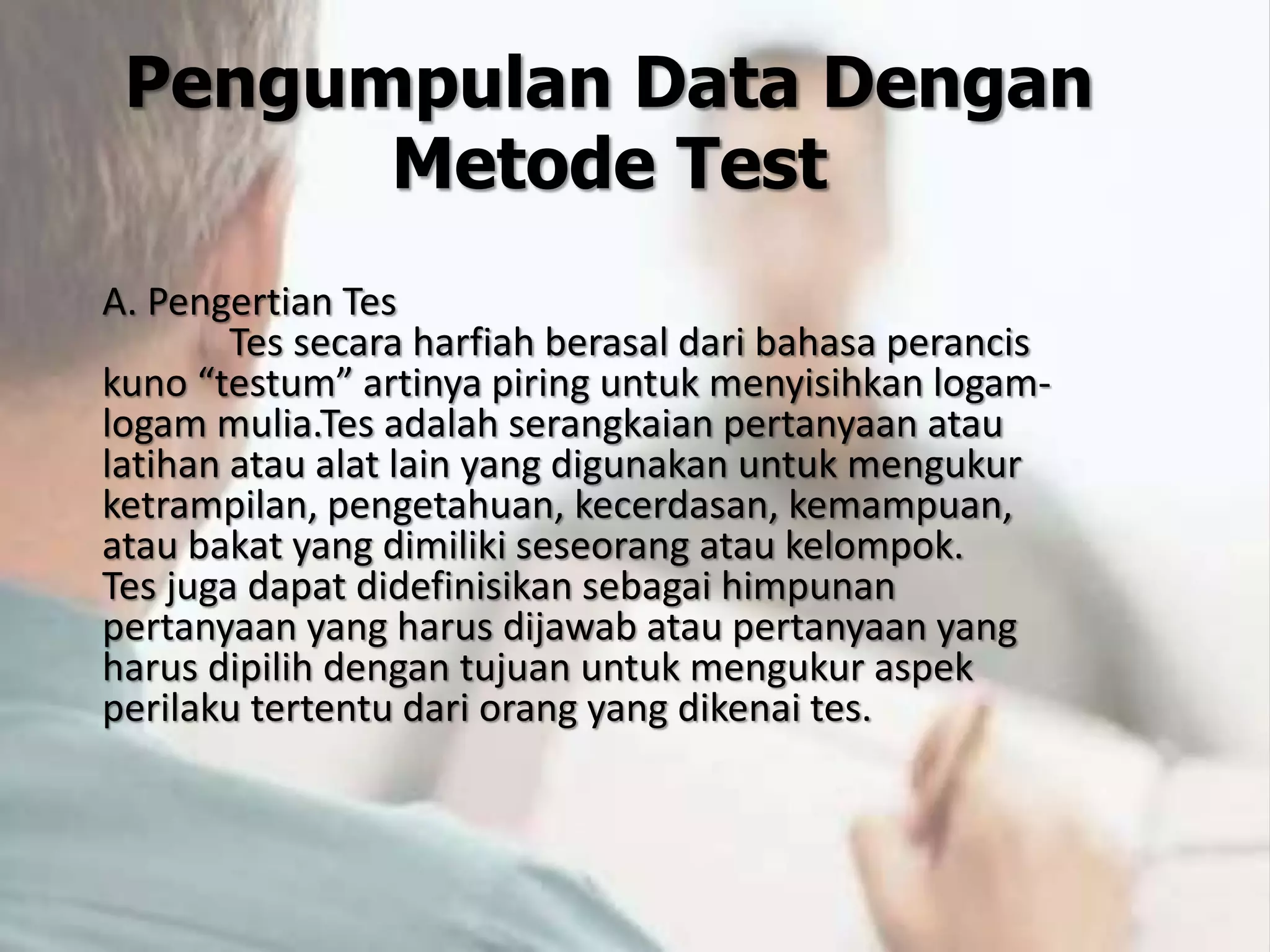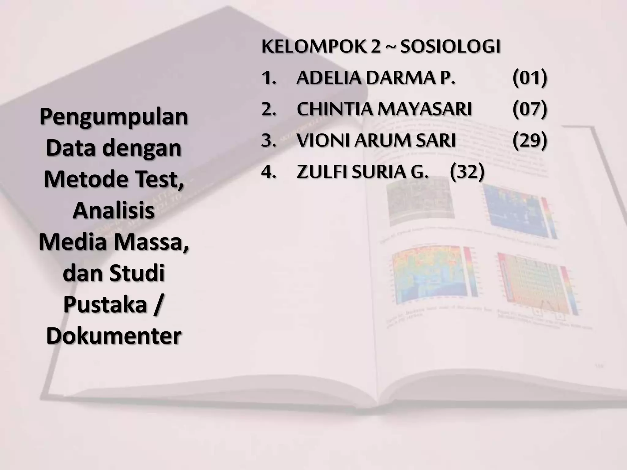 Dokumen ini membahas tentang metode pengumpulan data dalam penelitian, termasuk metode test, analisis media massa, dan studi pustaka/dokumenter. Setiap metode memiliki kelebihan dan kelemahan, seperti akurasi pada teknik test dan ruang lingkup pada analisis media massa, serta manfaat dari studi dokumentasi yang memungkinkan analisis data historis. Penelitian ini menekankan pentingnya pemilihan sumber data yang tepat dan kritik terhadap dokumen yang digunakan.
