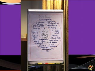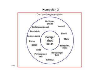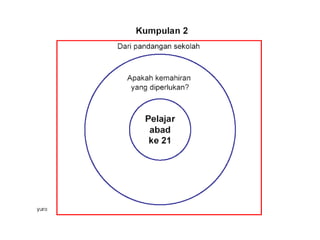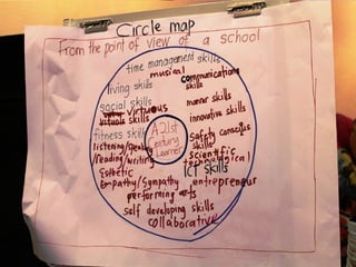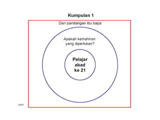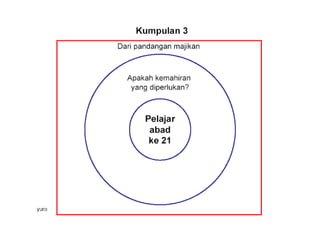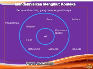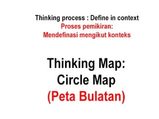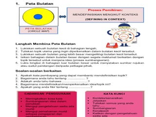 Dokumen ini membahas tentang pemetaan pemikiran (circle map) sebagai alat untuk mendefinisikan konteks dan meningkatkan kemahiran berfikir. Ia juga memberikan cadangan penggunaan peta bulatan untuk meningkatkan kosa kata dan pemahaman pelajar dalam kumpulan. Selain itu, tugas berkaitan peta bulatan disusun untuk menggambarkan peranan guru di abad ke-21 dan topik berdasarkan subjek masing-masing.