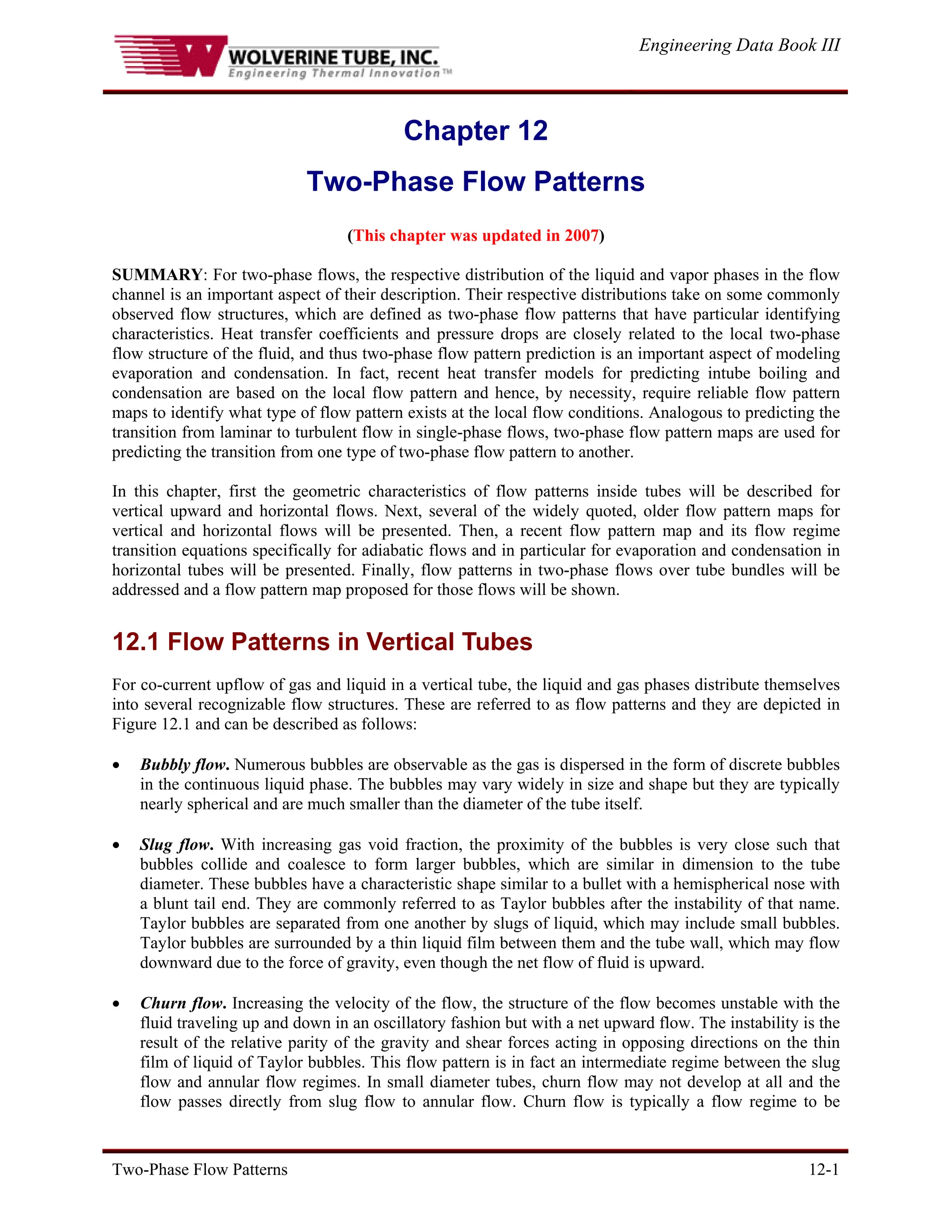This document discusses two-phase flow patterns, focusing on the distribution of liquid and vapor phases in flow channels, which are crucial for modeling evaporation and condensation processes. It describes different flow patterns such as bubbly, slug, churn, annular, and mist flow, detailing their characteristics and transitions in both vertical and horizontal tubes. Additionally, it presents flow pattern maps that are essential for predicting flow regimes under various conditions.