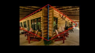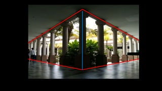 The document discusses two-point perspective in drawings. It notes that when building corners face the viewer, there are two vanishing points located on the same horizon line. The sides of buildings appear smaller as they recede into the distance on both sides. The document encourages the reader to imagine the perspective lines in sample photos and promises that drawing a building with two vanishing points is no harder than with one vanishing point.