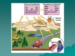This document provides an introduction to air pollution presented by Capt. Adib Bin Rashid. It defines air pollution and discusses the types and sources, including the burning of fossil fuels, agricultural activities, exhaust from factories and industries, mining operations, and indoor air pollution. Major air pollutants like sulfur dioxide and effects like respiratory and heart problems, global warming, acid rain, and depletion of the ozone layer are explained. Solutions to air pollution like using public transportation and conserving energy are also provided.