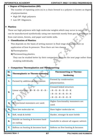 The document provides a comprehensive overview of polymers and rubbers, including their definitions, types, and applications, focusing on the properties, fabrication techniques, and uses of various polymers such as PMMA, Kevlar, and phenol formaldehyde resin. It details the processes of polymerization, compounding, and molding methods including compression, injection, transfer, and extrusion. Additionally, it discusses polymers' roles in medicine, highlighting their biocompatibility and applications in medical devices.