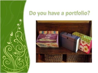 The document discusses professional portfolios for nurses. A professional portfolio is a collection of evidence that demonstrates a nurse's competencies, career achievements, goals and continuing professional development. Portfolios provide evidence of ongoing competence, demonstrate skills to employers, help nurses take control of their professional development and meet registration standards. An effective portfolio goes beyond a resume by including evidence of competencies and expertise. The document provides guidance on identifying the purpose and audience of a portfolio, relevant content to include, and types of portfolio layouts.