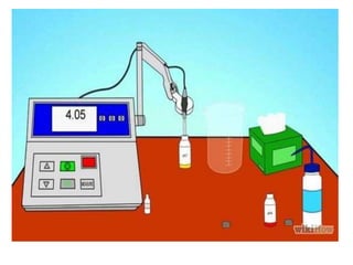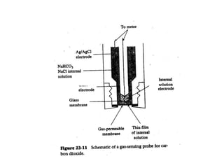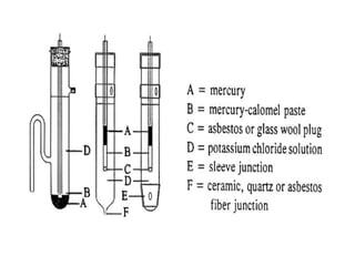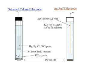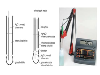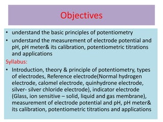 Potentiometry involves measuring the potential difference between two electrodes under equilibrium conditions. There are two main types of electrodes - reference electrodes that maintain a constant potential, and indicator or working electrodes whose potential varies with ion concentration. Common reference electrodes include the standard hydrogen electrode, saturated calomel electrode, and silver/silver chloride electrode. Indicator electrodes include glass membrane electrodes for measuring pH and ion-selective electrodes that respond selectively to specific ions. Potentiometry is used for pH measurements, ion-selective measurements, and potentiometric titrations.