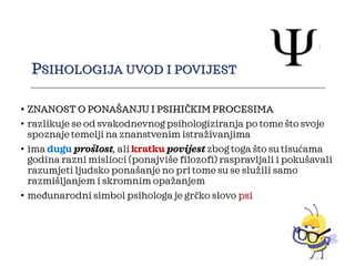Psihologija je znanost koja proučava ponašanje i psihičke procese temeljeći se na znanstvenim istraživanjima. Njeni ciljevi uključuju opisivanje, objašnjavanje, predviđanje i utjecanje na ljudsko ponašanje kroz razne psihičke procese. Povijest psihologije kao znanosti počinje 1879. godine kada je Wilhelm Wundt osnovao prvi laboratorij za eksperimentalnu psihologiju.
