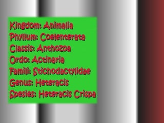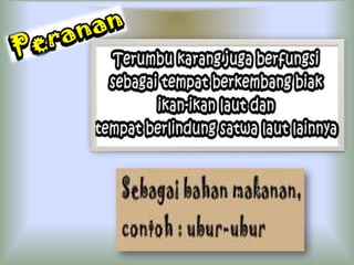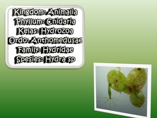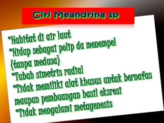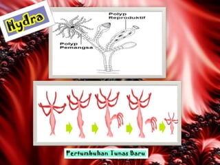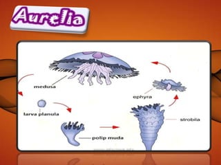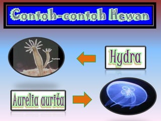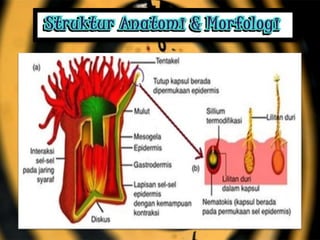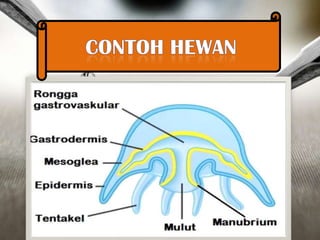 Dokumen ini menjelaskan ciri-ciri dan klasifikasi coelenterata, termasuk perbedaan struktur tubuh dalam kelas hydrozoa, schyphozoa, dan anthozoa. Coelenterata memiliki tubuh radial simetris, sistem pencernaan, pernapasan melalui difusi, dan reproduksi melalui metagenesis. Selain itu, dokumen ini menjelaskan jenis-jenis sel dan struktur yang terdapat dalam coelenterata serta manfaatnya dalam kehidupan sehari-hari.