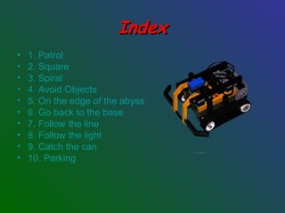 1. The document outlines 10 practices using Robolab including having the robot patrol by going forward, spinning, and repeating, follow a square path, follow a spiraling path where the side increases each lap, avoid objects by backing up and turning when its contact sensor is triggered, avoid falling off edges by backing up and changing direction when its light sensor detects a change, go backwards to its starting point after hitting an object, follow a black line using its light sensors, follow a light source by spinning until it detects above a light threshold then moving forward, and catch a can by pushing it back to its starting place after its contact sensor detects hitting the can.