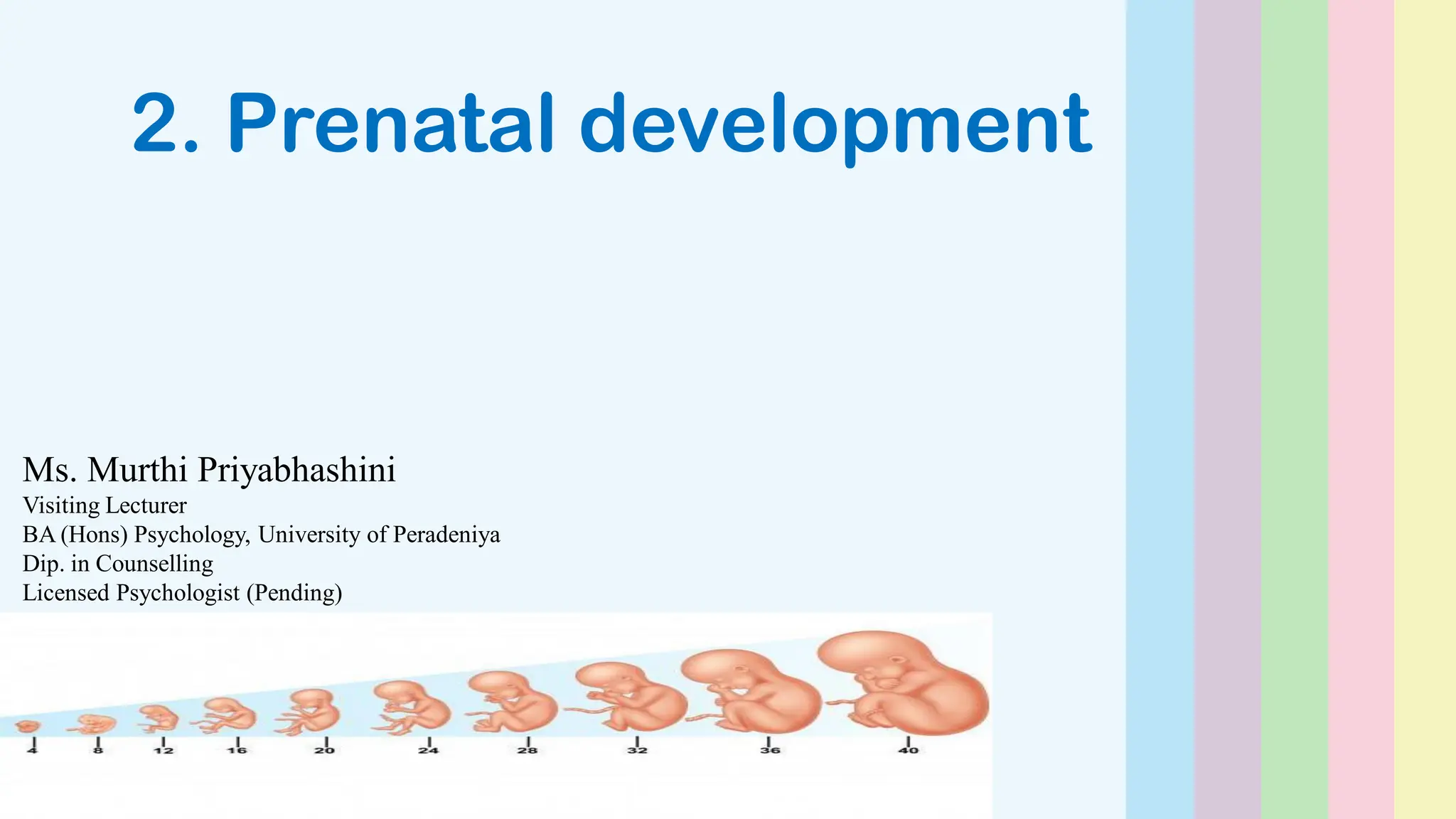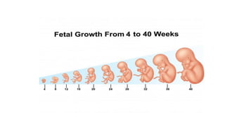The document discusses prenatal development, detailing the processes from conception to the stages of fetal growth. Key stages include the germinal, embryonic, and fetal phases, highlighting the physical growth and development of the baby in the womb. It also emphasizes the importance of monitoring physical development indicators before birth and how prenatal experiences can influence future growth.