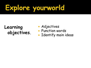 This document provides an overview of key grammar concepts including adjectives, function words, and identifying main ideas. It defines adjectives as words that describe or modify nouns, and provides examples. It explains that the main idea is the most important information the author wants to convey about the topic. It also lists and defines different types of function words like prepositions, pronouns, determiners, and conjunctions. The document concludes with a quotation, facts of the week, and a link for additional reading.