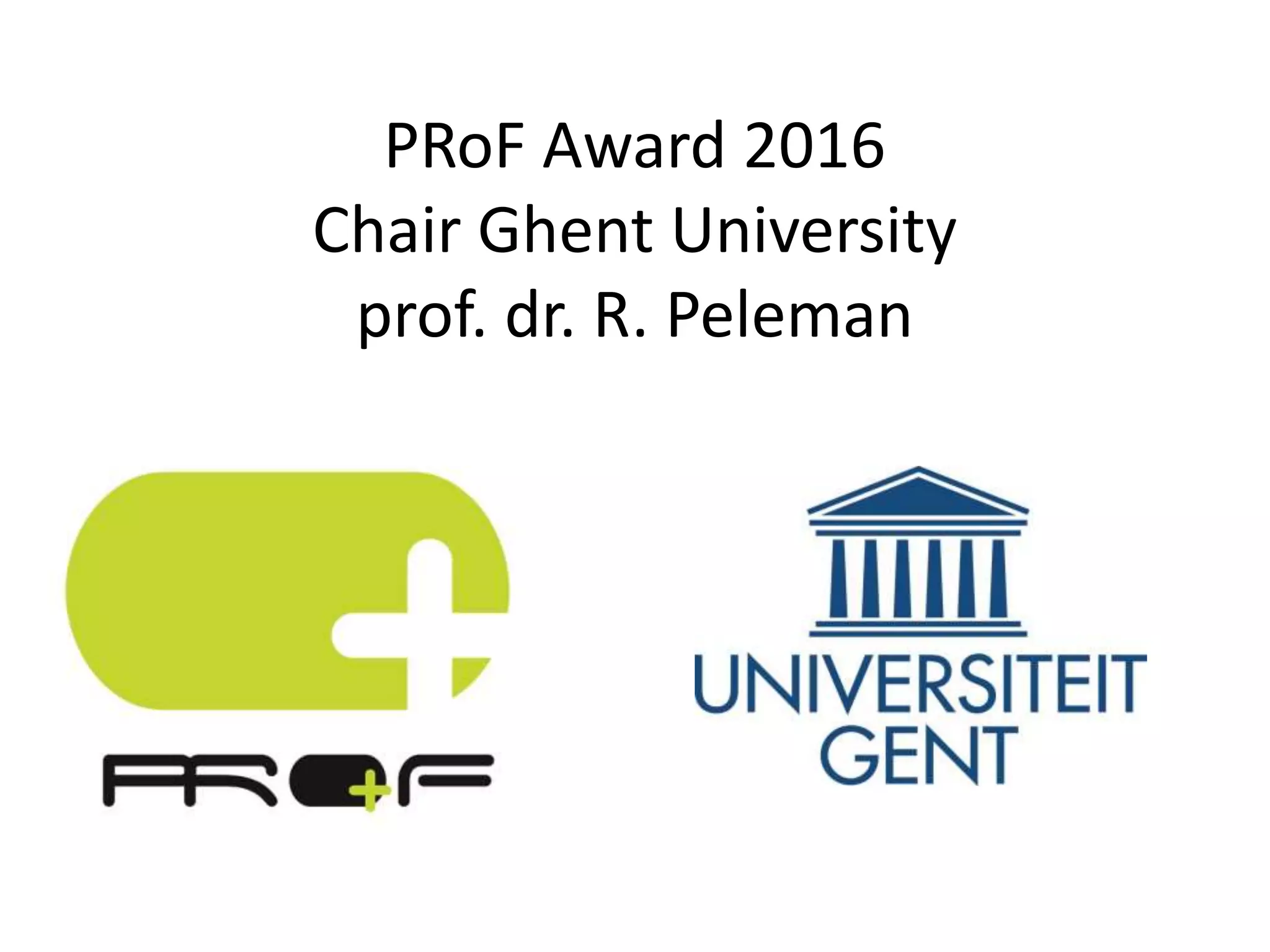 The document summarizes the PRoF Award 2016 given to Renaat Peleman, Chief Medical Officer of Ghent University Hospital. PRoF is an international open innovation consortium focused on envisioning the future of healthcare. Since 2009, it has created concept rooms for future patient rooms, residences, and recovery rooms. The award recognized Peleman's work using an interdisciplinary approach to stimulate innovation and quality improvement in healthcare.