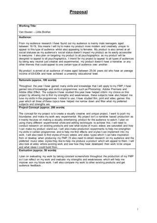 The document outlines a proposal for a final major project (FMP) to create an experimental music video. The target audience is identified as males aged 16-19, with the goal of appealing to a wide range of demographics. Research will include analyzing existing music videos, conducting audience surveys and interviews, and testing production techniques. Pre-production will include concept boards, style guides, and shot lists. The 8 week production schedule outlines tasks such as filming, editing, and evaluation. Feedback will be gathered through questionnaires, peer reviews, and self-evaluation. The bibliography provides 8 sources for research, including audience surveys, interviews, existing music videos, and a survey about music video preferences.