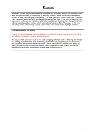 The document outlines a proposal for a major project promoting a fictional photographer's debut exhibit through social media advertising. The target audience is millennials aged 18-mid 20s from middle-class backgrounds who have disposable income. Research will include examining existing art promotion strategies and depictions in media like Gossip Girl. Content will include magazine articles, flyers, and a social media campaign showcasing the photographer's nature-themed photos. Progress will be evaluated through ongoing reflection in a development diary. The schedule allocates weeks for research, production, and contingency.